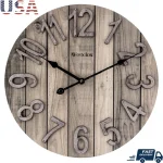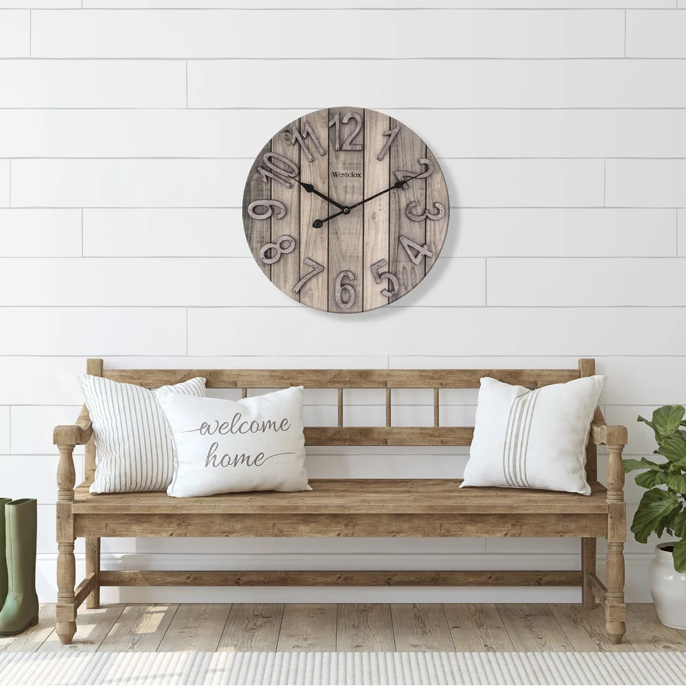 Crafted with precision from high-quality MDF and adorned with a captivating natural wood grain veneer finish, this clock effortlessly combines rustic aesthetics with contemporary functionality. The raised numbers, finished elegantly in galvanized tones, add a touch of sophistication to its overall design. Featuring slatted groove planks and a thoughtfully crafted reclaimed look, this clock emanates a classic farmhouse ambiance, enriching any space it graces. Operating this exquisite timepiece is as simple as inserting a single AA battery, effortlessly blending convenience with style.