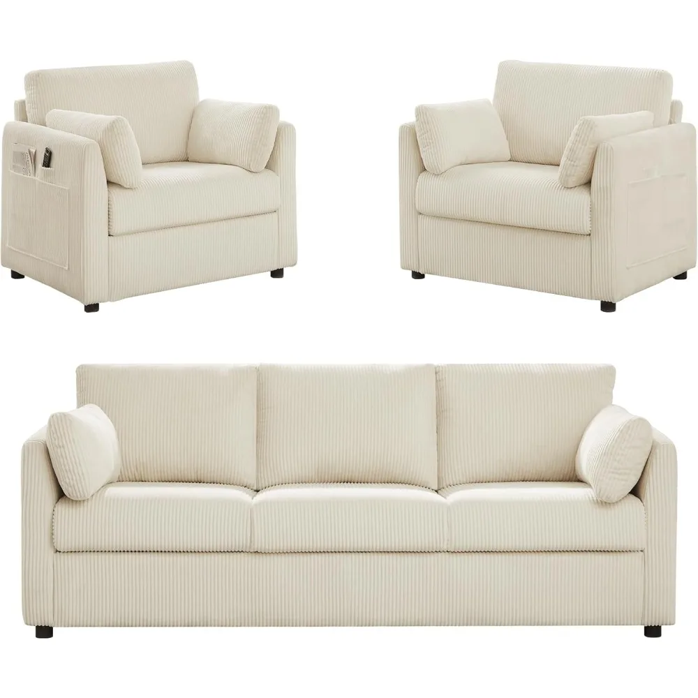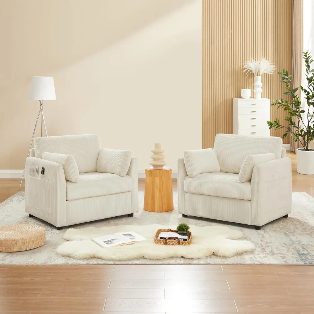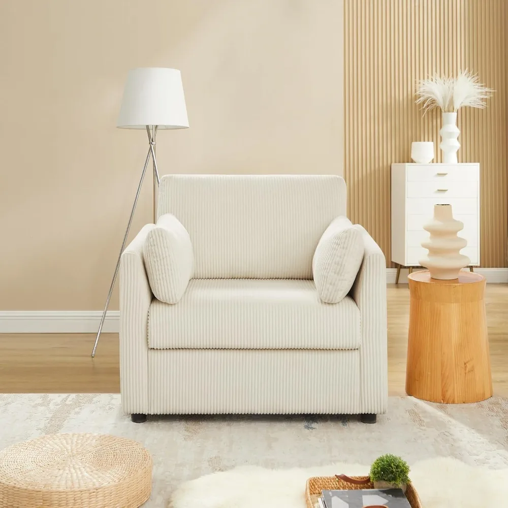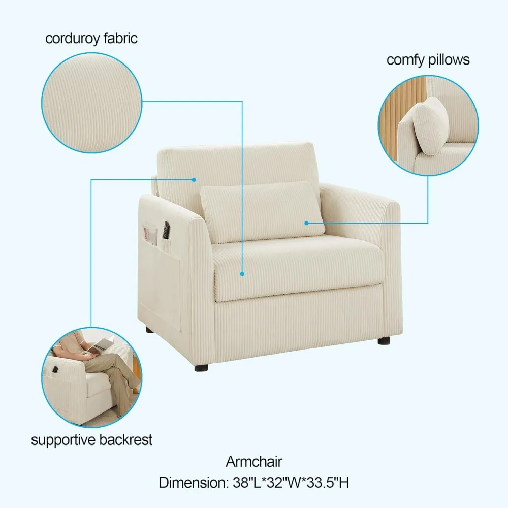 Modern Corduroy Accent Chair, 38 W Comfy Armchair with Soft Pillows and Side Pockets, for Living Room, Bedroom