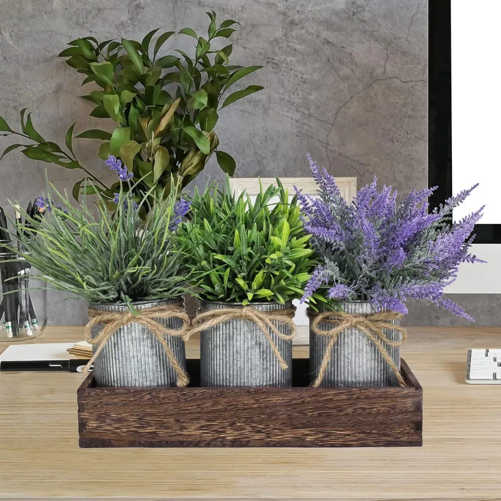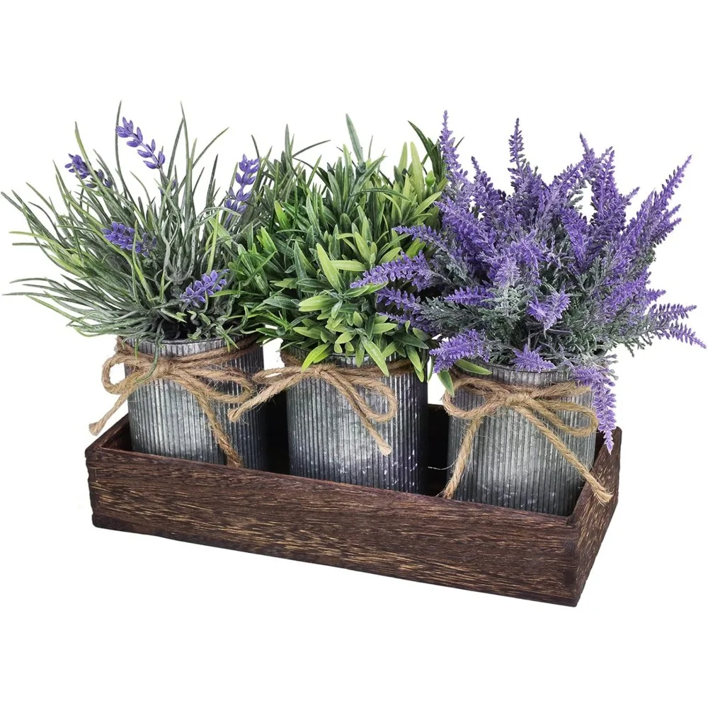 - Quantity: Package includes 1 rectangular wooden box and 3 pcs rustic galvanized metal pots with 2 pcs fake lavender bushes and 1 fake grass bush. The galvanized pots, wood container, and artificial greenery can be used together or separately, for mixing flowers and green plants yourself or displaying accent items. Beautiful set of 3 artificial potted plants makes a perfect centerpiece for your farmhouse table this spring and summer and creates a comforting atmosphere in your space.