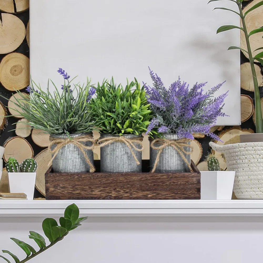 - Quantity: Package includes 1 rectangular wooden box and 3 pcs rustic galvanized metal pots with 2 pcs fake lavender bushes and 1 fake grass bush. The galvanized pots, wood container, and artificial greenery can be used together or separately, for mixing flowers and green plants yourself or displaying accent items. Beautiful set of 3 artificial potted plants makes a perfect centerpiece for your farmhouse table this spring and summer and creates a comforting atmosphere in your space.